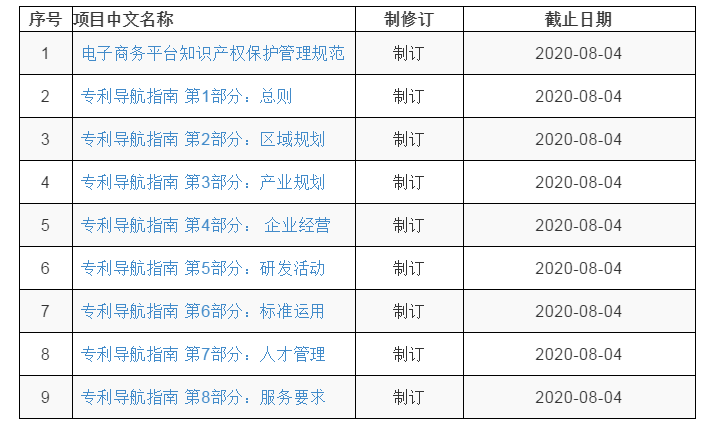 日前,国家标准委决定对《专利导航指南 第1部分:总则》等9项拟立项国家标准项目公开征求意见,征求意见截止时间为2020年8月4日。请登录全国标准信息公共服务平台的拟立项标准公示网页http://std.samr.gov.cn/gb/gbSuggestionPlan?bId=2181,查询项目信息和反馈意见建议。