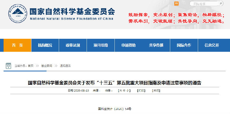 国家自然科学基金委员会关于发布“十三五”第五批重大项目指南及申请注意事项的通告