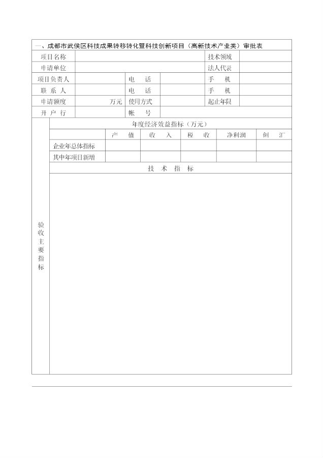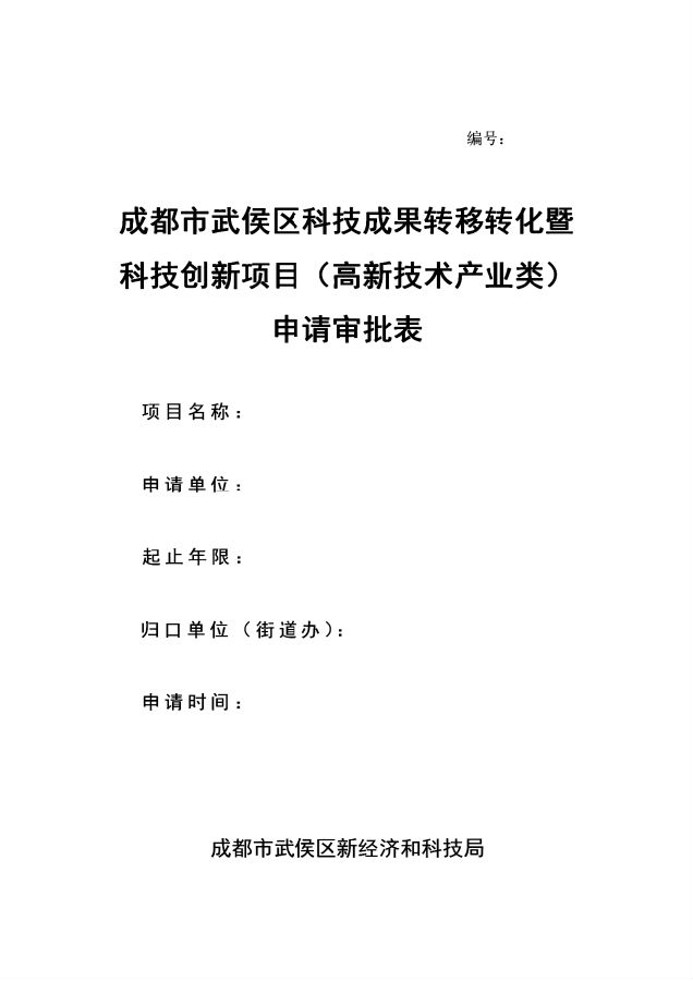 1、填写《成都市武侯区科技成果转移转化暨科技创新项目(高新技术产业类)申请审批表》。