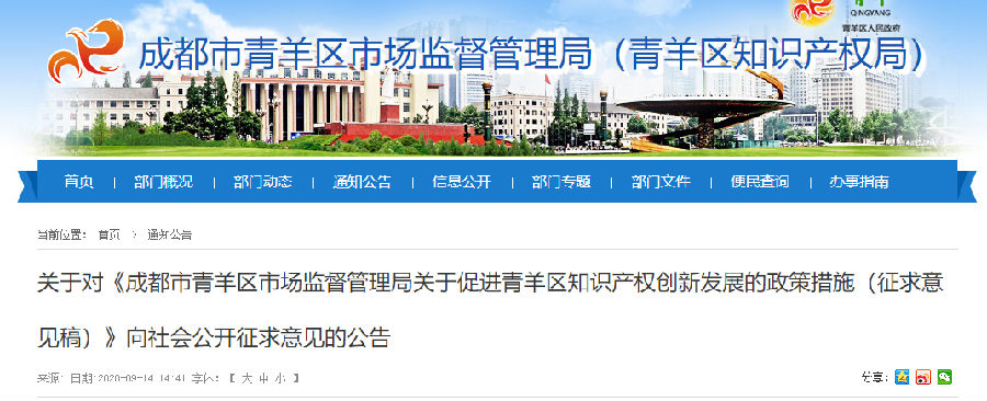 为进一步鼓励青羊区知识产权创新创造,持续优化营商环境,助力经济高质量发展,根据《成都市市场监督管理局关于印发<关于促进知识产权创新发展的政策措施>的通知》(成市监发〔2020〕60号)和《成都市青羊区人民政府关于印发<成都市青羊区知识产权资助管理办法(试行)>的通知》(成青府函〔2019〕158号)文精神,结合青羊区实际,我局拟制了《成都市青羊区市场监督管理局关于促进青羊区知识产权创新发展的政策措施(征求意见稿)》,现向社会公开征求意见,欢迎有关单位和社会各界人士就有关内容提出宝贵意见和建议。