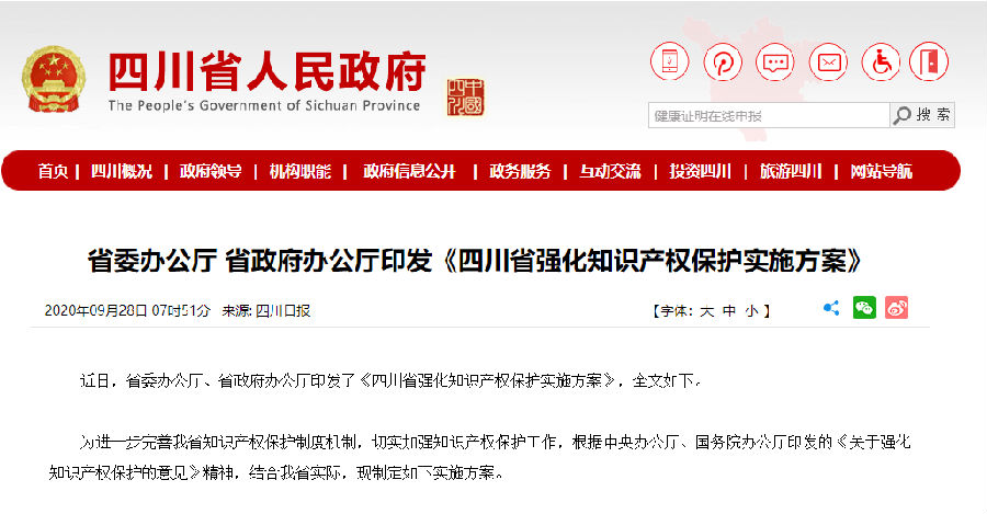 近日,省委办公厅、省政府办公厅印发了《四川省强化知识产权保护实施方案》,全文如下。