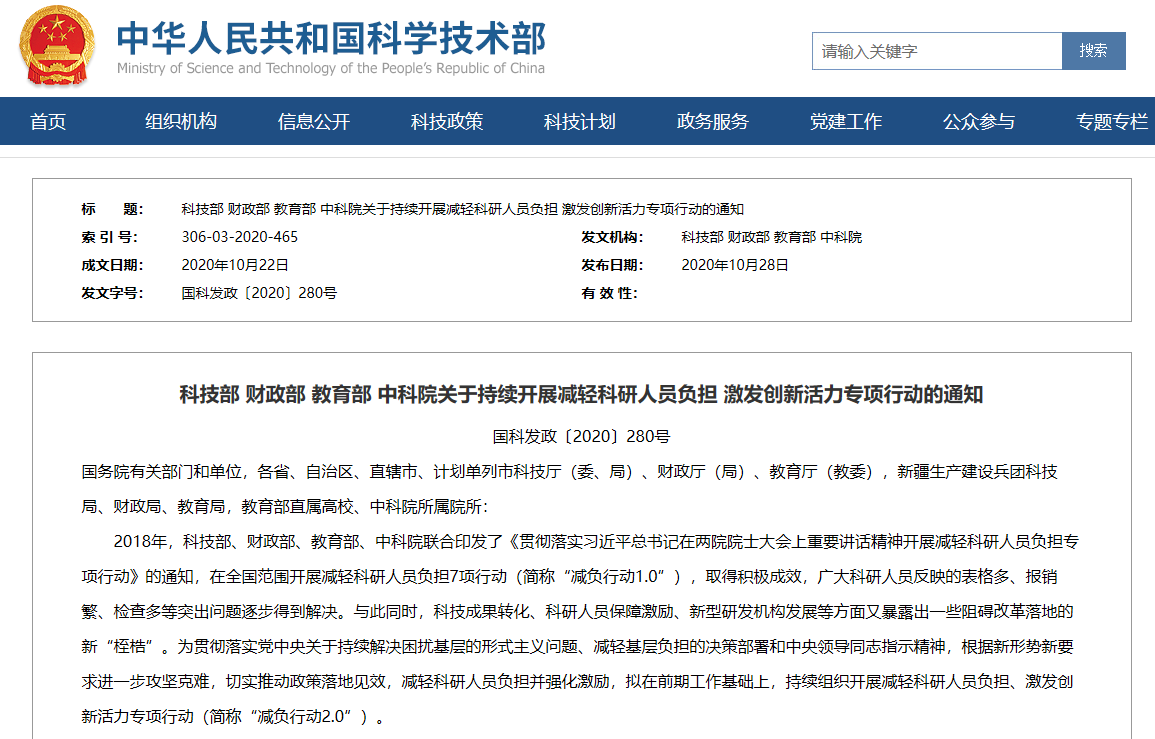 科技部 财政部 教育部 中科院关于持续开展减轻科研人员负担 激发创新活力专项行动的通知