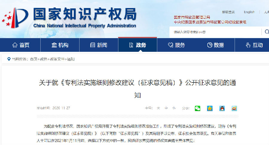 关于就《专利法实施细则修改建议(征求意见稿)》公开征求意见的通知