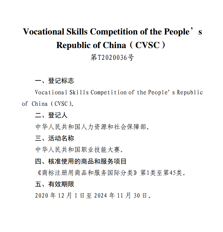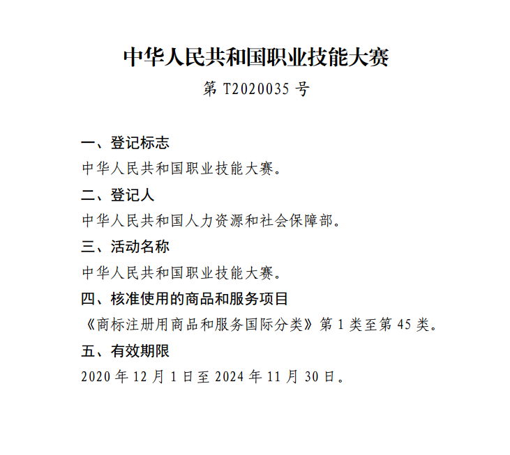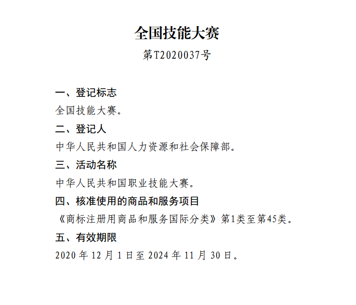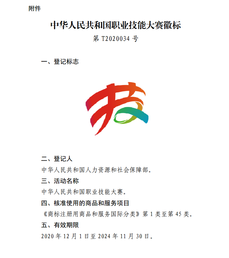 国家知识产权局关于核准“中华人民共和国职业技能大赛徽标”等4件特殊标志登记的公告