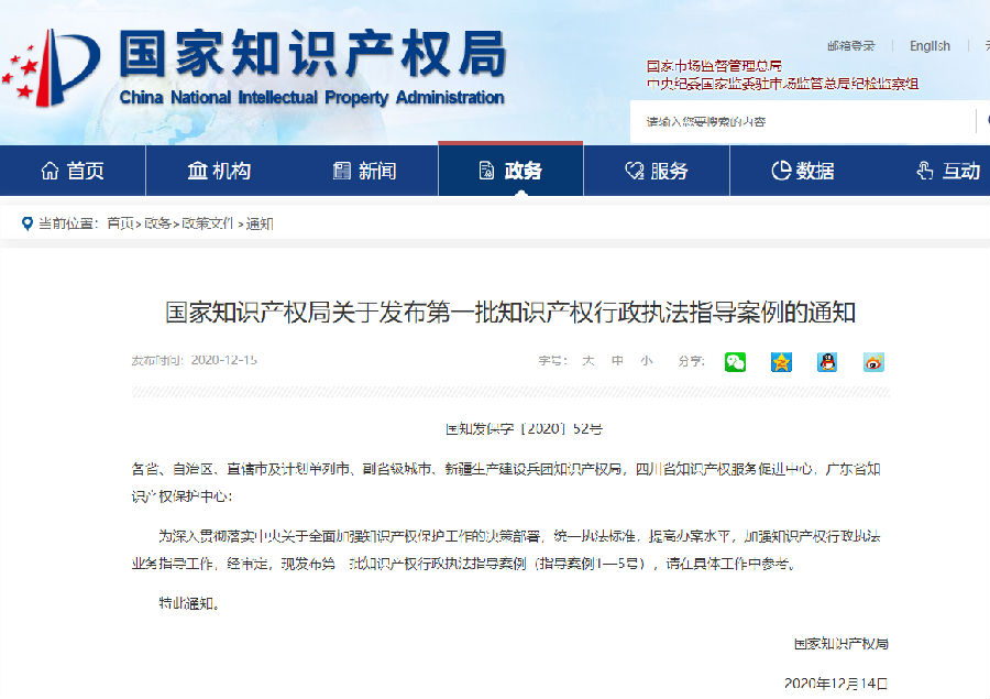为深入贯彻落实中央关于全面加强知识产权保护工作的决策部署,统一执法标准,提高办案水平,加强知识产权行政执法业务指导工作,经审定,现发布第一批知识产权行政执法指导案例(指导案例1—5号),请在具体工作中参考。