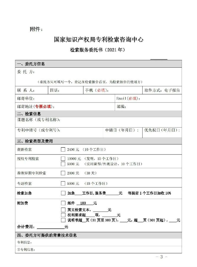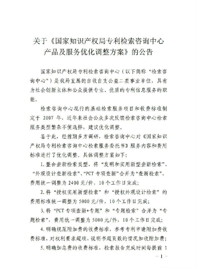 据其官方发布的“关于《国家知识产权局专利检索咨询中心产品及服务优化调整方案》的公告”显示,自2021年01月01日起,检索咨询中心对《国家知识产权局专利检索咨询中心检索服务委托书》服务内容和费用标准进行了优化调整。