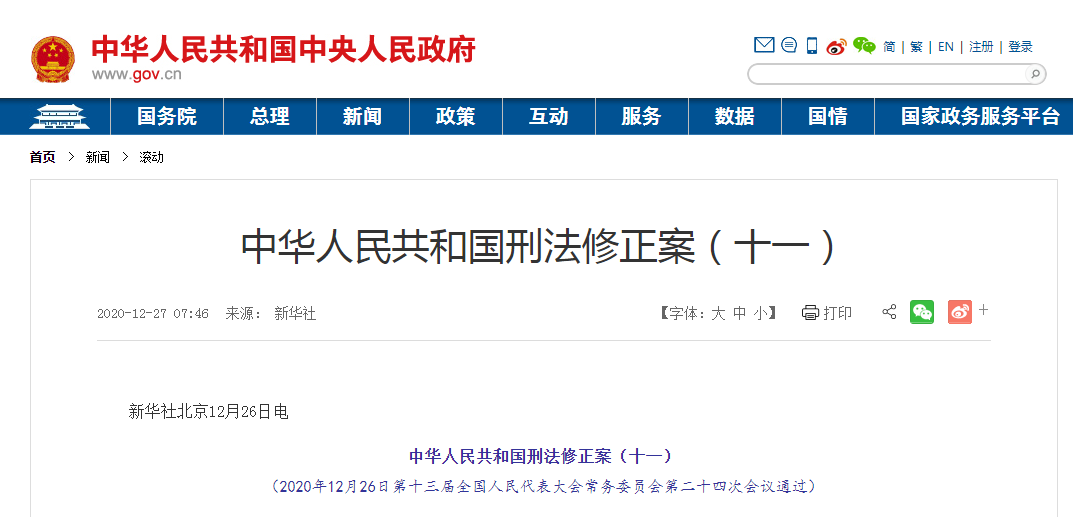 刑法修正案(十一)于2020年12月26日第十三届全国人民代表大会常务委员会第二十四次会议通过,将于2021年3月1日起施行。