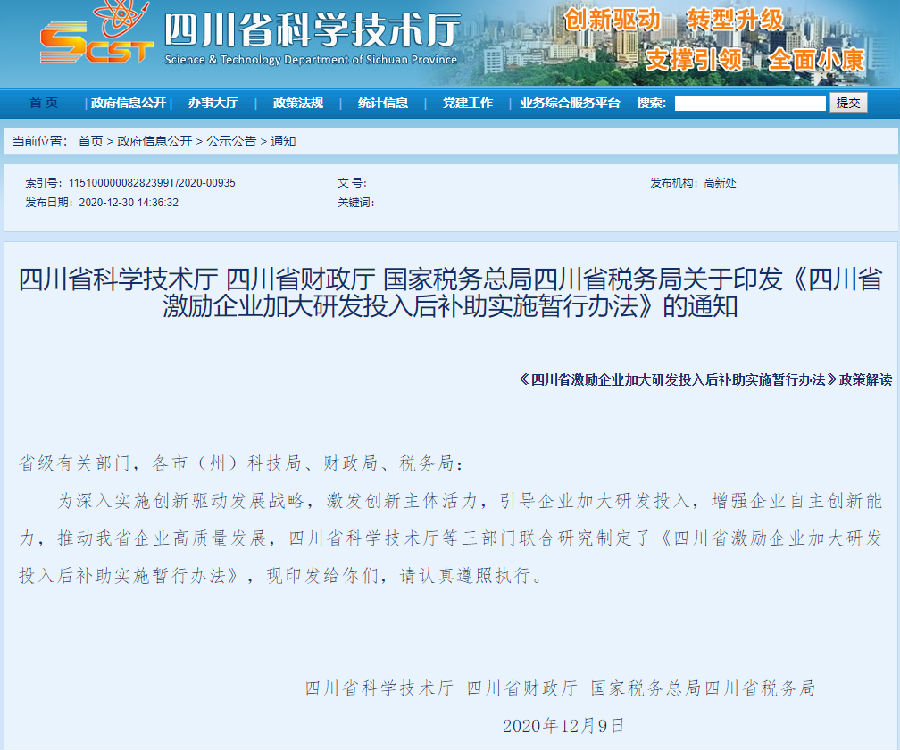 为深入实施创新驱动发展战略,激发创新主体活力,引导企业加大研发投入,增强企业自主创新能力,推动我省企业高质量发展,四川省科学技术厅等三部门联合研究制定了《四川省激励企业加大研发投入后补助实施暂行办法》,现印发给你们,请认真遵照执行。