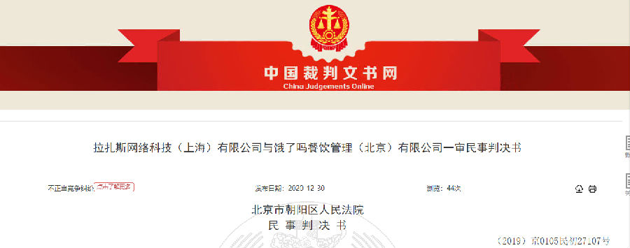 2020年12月30日,中国裁判文书网发布了一份由北京市朝阳区人民法院(下称朝阳法院)作出的(2019)京0105民初27107号《拉扎斯网络科技(上海)有限公司与饿了吗餐饮管理(北京)有限公司一审民事判决书》。该案中,“饿了么”在线外卖平台运营方拉扎斯网络科技(上海)有限公司(下称拉扎斯公司)以不正当竞争为由将饿了吗餐饮管理(北京)有限公司(下称饿了吗公司)诉至法院。