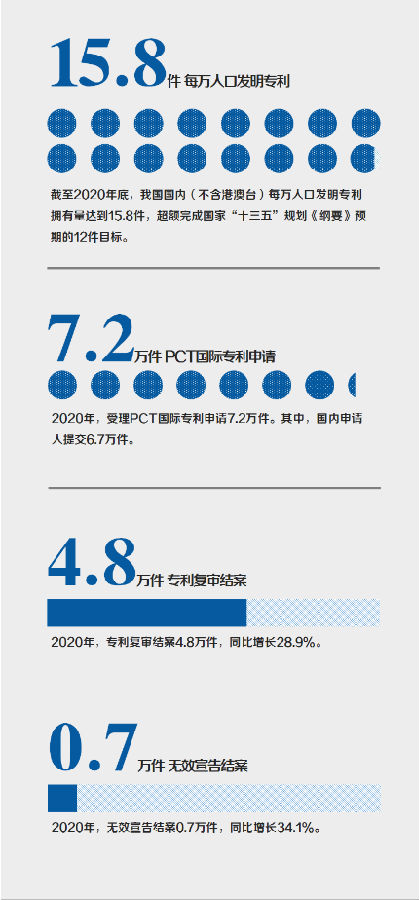2020年,我国发明专利授权53.0万件。截至2020年底,我国国内(不含港澳台)发明专利有效量221.3万件。每万人口发明专利拥有量达到15.8件,超额完成国家“十三五”规划《纲要》预期的12件目标。 2020年,受理PCT国际专利申请7.2万件,其中国内申请人提交6.7万件。 2020年,我国实用新型专利授权237.7万件,外观设计专利授权73.2万件。专利复审结案4.8万件,同比增长28.9%,无效宣告结案0.7万件,同比增长34.1%。