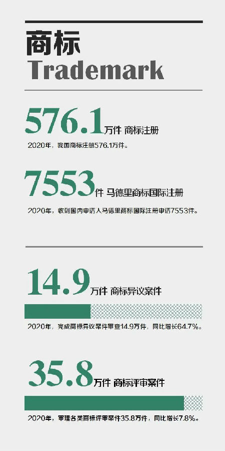 2020年,我国商标注册576.1万件。收到国内申请人马德里商标国际注册申请7553件。