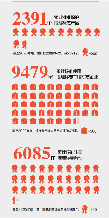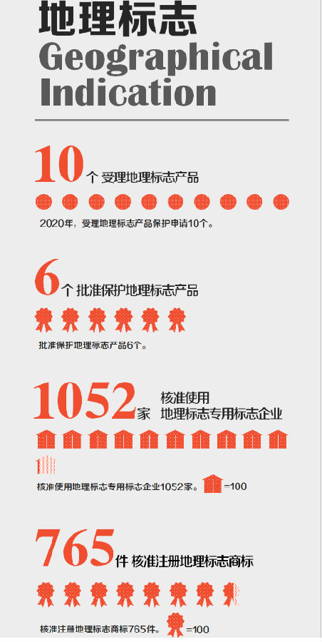 2020年,受理地理标志产品保护申请10个,批准保护地理标志产品6个,核准使用地理标志专用标志企业1052家,核准注册地理标志商标765件。截至2020年底,累计批准地理标志产品2391个,核准专用标志使用企业9479家,累计注册地理标志商标6085件。