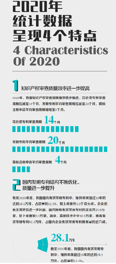 2020年,我国知识产权审查提质增效稳步推进,高价值专利审查周期压减至14个月,发明专利平均审查周期压减至20个月,商标注册申请平均审查周期缩短至4个月。