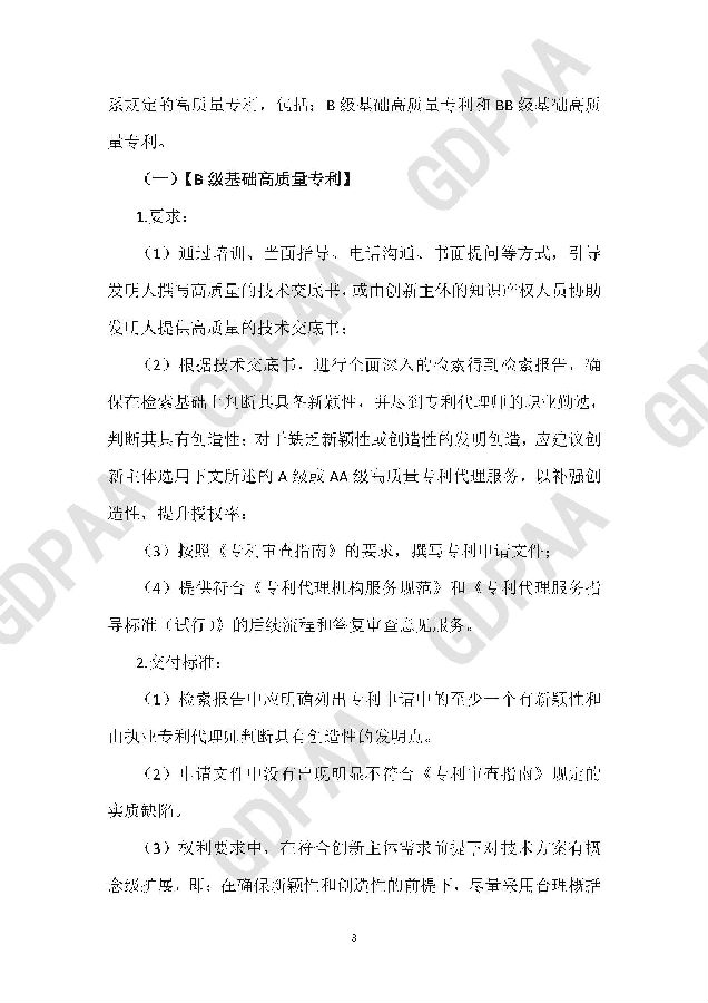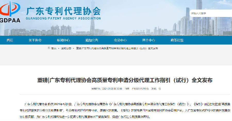 广东专利代理协会 昨天2021年1月9日,广东专利代理协会在穗发布《广东专利代理协会高质量专利申请分级代理工作指引(试行)》。《指引》创造性地提出“高质量专利代理服务的分级分类收费制度”,引导专利代理机构专业化、高端化的发展。《指引》的发布是国内省级专利代理协会首创之举,为广东省专利代理行业的良性发展做出积极贡献,为广东专利代理机构进一步提高专利代理服务水平做出指引,促进广东打造专利质量新高地。