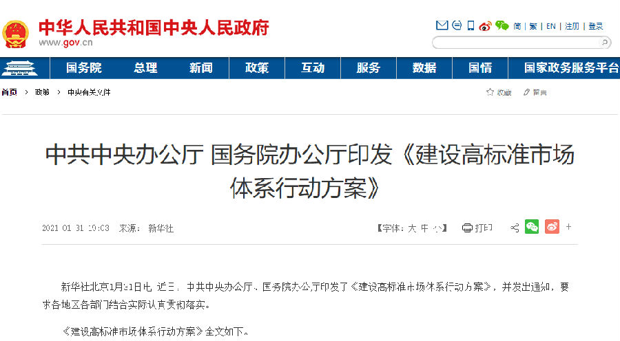 《建设高标准市场体系行动方案》全文如下。