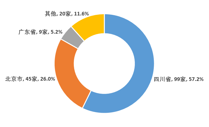 2020年,注册备案知识产权服务机构达到173家,来自全国12个省、直辖市、自治区。四川99家,北京45家,广东9家,其余各省市共20家(包括重庆6家、上海4家,河南、江苏、湖南各2家,陕西、浙江、云南、内蒙古各1家)。占比情况如下: