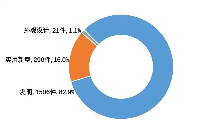 2020年,共计受理专利快速预审案件1817件,其中发明1506件,实用新型290件,外观设计21件,占比情况如下: