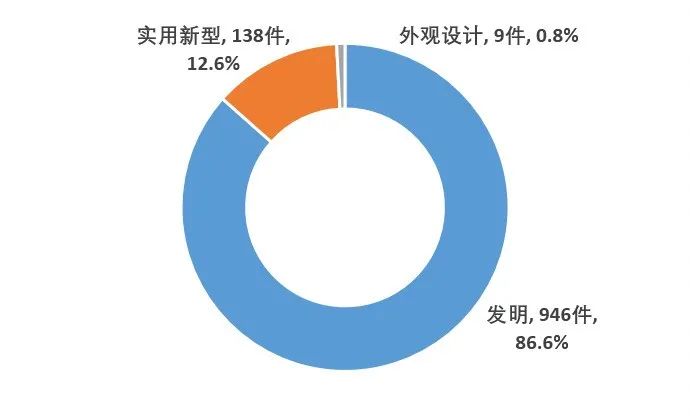 2020年,预审合格加快案件1093件,占预审申请总量的60.2%,其中发明946件,实用新型138件,外观设计9件,占比情况如下: