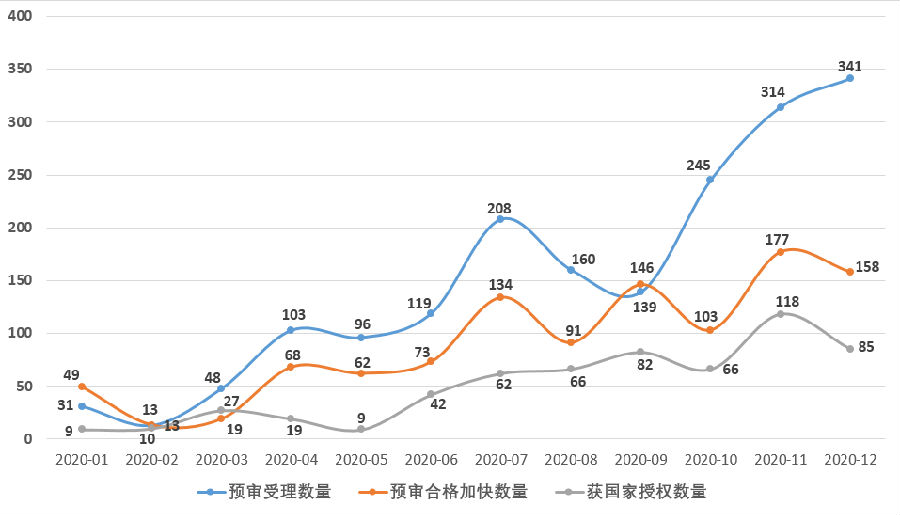 2020年,预审案件各月预审受理数量、预审合格加快数量、获国家授权数量趋势如下图所示: