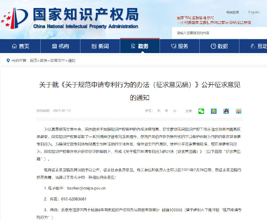 关于就《关于规范申请专利行为的办法(征求意见稿)》公开征求意见的通知