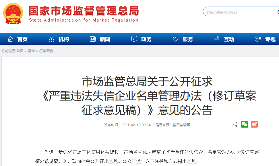 为进一步深化市场主体信用体系建设,市场监管总局起草了《严重违法失信企业名单管理办法(修订草案征求意见稿)》,现向社会公开征求意见。公众可通过以下途径和方式提出意见: