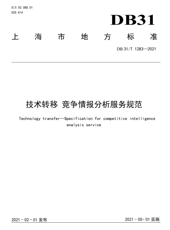 近日,上海市市场监督管理局正式发布《技术转移 竞争情报分析服务规范》《技术转移 技术评价规范》上海市地方标准,两项标准于2021年5月1日起实施。