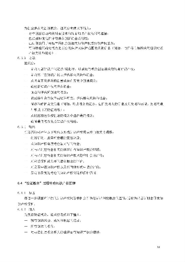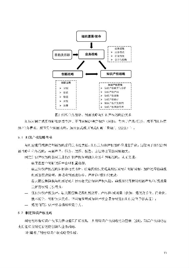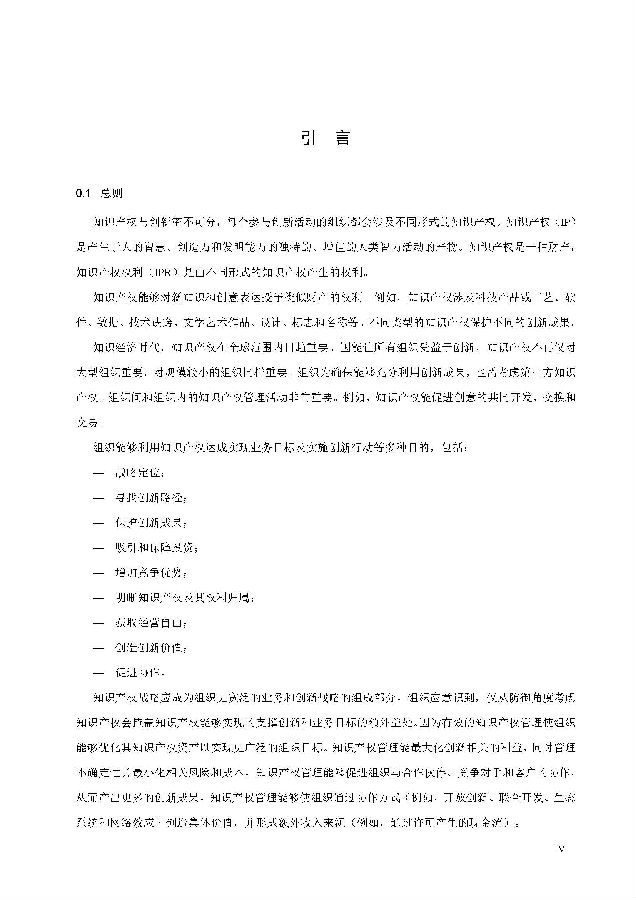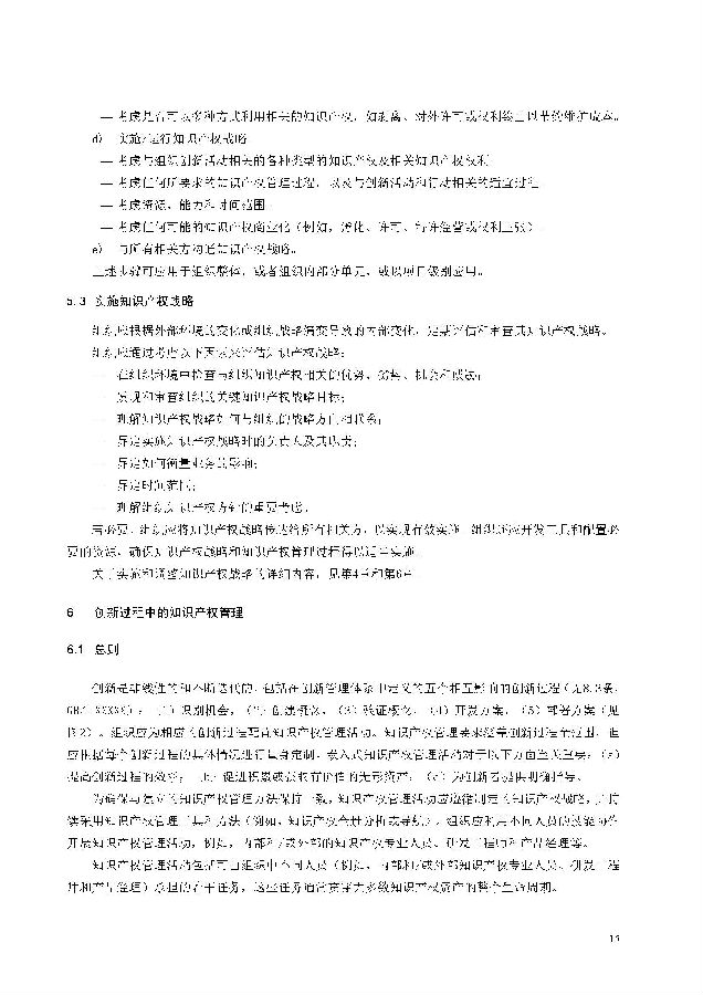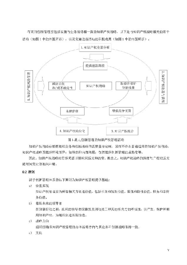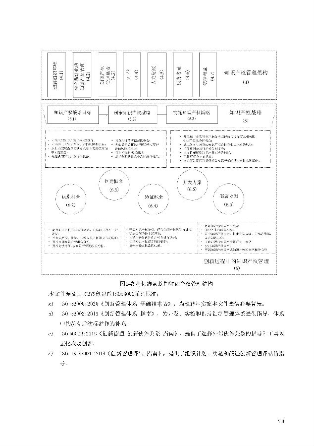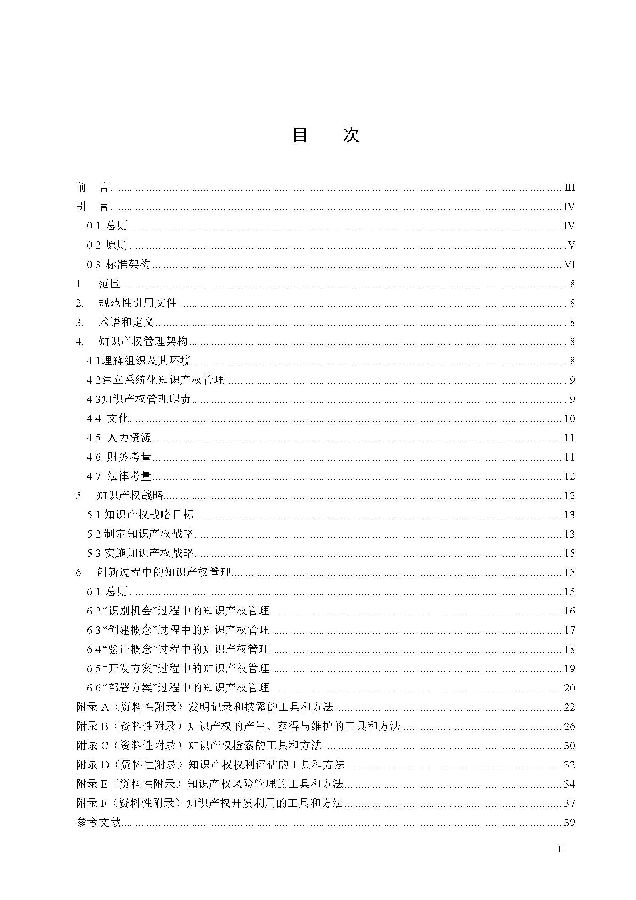 本标准包括:前言;引言;第1章 范围;第2章 规范性引用文件;第3章 术语和定义;第4章 知识产权管理架构;第5章 知识产权战略;第6章 创新过程中的知识产权管理;