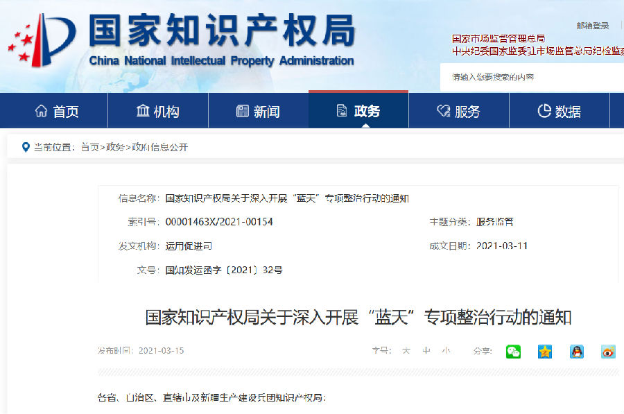 国家知识产权局关于深入开展“蓝天”专项整治行动的通知