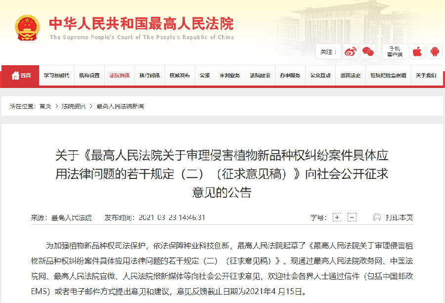为加强植物新品种权司法保护,依法保障种业科技创新,最高人民法院起草了《最高人民法院关于审理侵害植物新品种权纠纷案件具体应用法律问题的若干规定(二)(征求意见稿)》。现通过最高人民法院政务网、中国法院网、最高人民法院官微、人民法院报新媒体等向社会公开征求意见,欢迎社会各界人士通过信件(包括中国邮政EMS)或者电子邮件方式提出意见和建议,意见反馈截止日期为2021年4月15日。