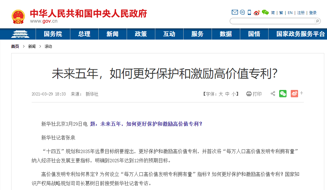 “十四五”规划和2035年远景目标纲要提出,更好保护和激励高价值专利,并首次将“每万人口高价值发明专利拥有量”纳入经济社会发展主要指标,明确到2025年达到12件的预期目标。
