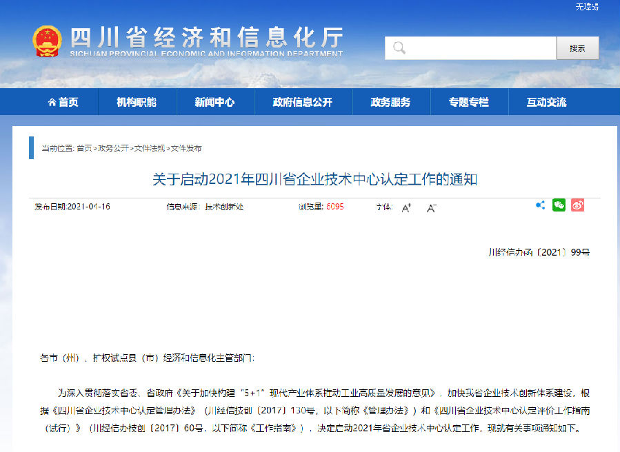 为深入贯彻落实省委、省政府《关于加快构建“5+1”现代产业体系推动工业高质量发展的意见》,加快我省企业技术创新体系建设,根据《四川省企业技术中心认定管理办法》(川经信技创〔2017〕130号,以下简称《管理办法》)和《四川省企业技术中心认定评价工作指南(试行)》(川经信办技创〔2017〕60号,以下简称《工作指南》),决定启动2021年省企业技术中心认定工作,现就有关事项通知如下。