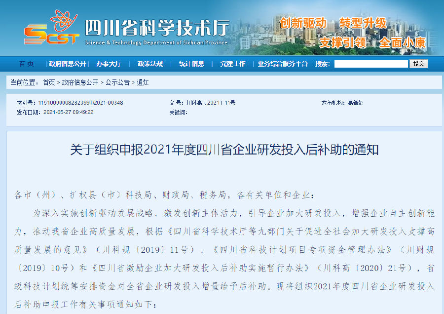 为深入实施创新驱动发展战略,激发创新主体活力,引导企业加大研发投入,增强企业自主创新能力,推动我省企业高质量发展,根据《四川省科学技术厅等九部门关于促进全社会加大研发投入支撑高质量发展的意见》(川科规〔2019〕11号)、《四川省科技计划项目专项资金管理办法》(川财规〔2019〕10号)和《四川省激励企业加大研发投入后补助实施暂行办法》(川科高〔2020〕21号),省级科技计划统筹安排资金对全省企业研发投入增量给予后补助。现将组织2021年度四川省企业研发投入后补助申报工作有关事项通知如下: