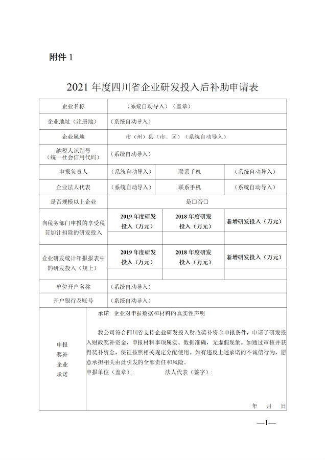 1.《2021年度四川省企业研发投入后补助申请表》(附件1);
