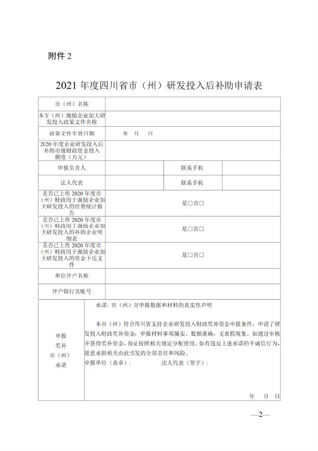 1.《2021年度四川省市(州)研发投入后补助申请表》(附件2);