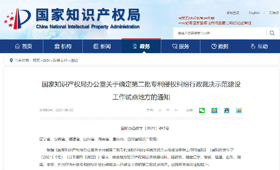 根据《国家知识产权局办公室关于开展第二批专利侵权纠纷行政裁决试点示范建设申报工作的通知》(国知办发保字〔2021〕9号)(以下简称《通知》)要求,结合地方知识产权局试点申报材料,经研究,确定辽宁、安徽、福建、山东、湖南、重庆、四川作为开展专利侵权纠纷行政裁决示范建设工作的第二批试点地方。现将有关事项通知如下: