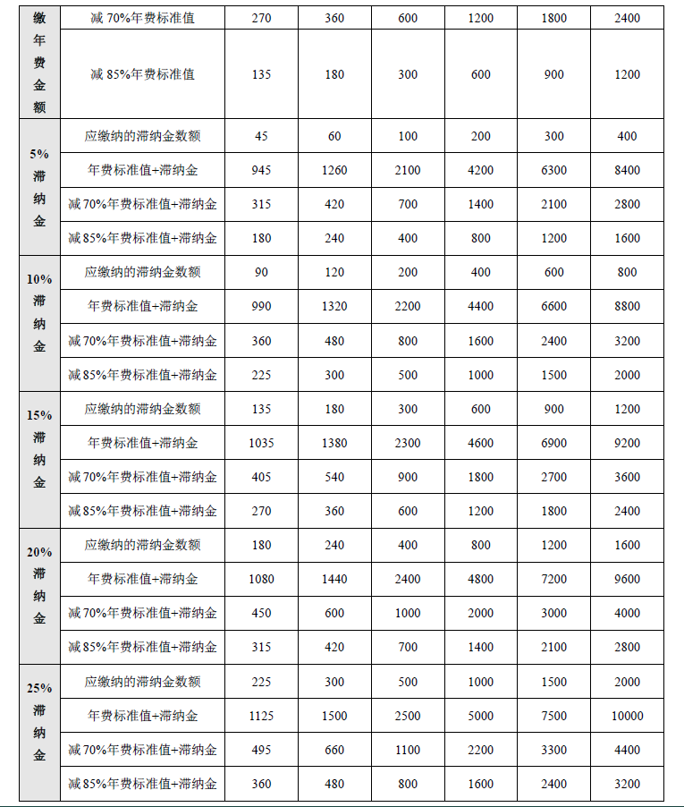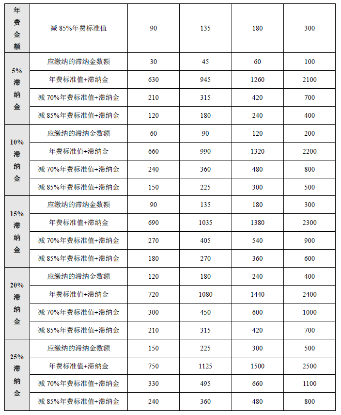 (1)专利权人未按时缴纳年费(不包括授予专利权当年的年费)或者缴纳的数额不足的,可以在年费期满之日起六个月内补缴,补缴时间超过规定期限但不足一个月时,不缴纳滞纳金。补缴时间超过规定时间一个月或以上的,缴纳按照下述计算方法算出的相应数额的滞纳金: