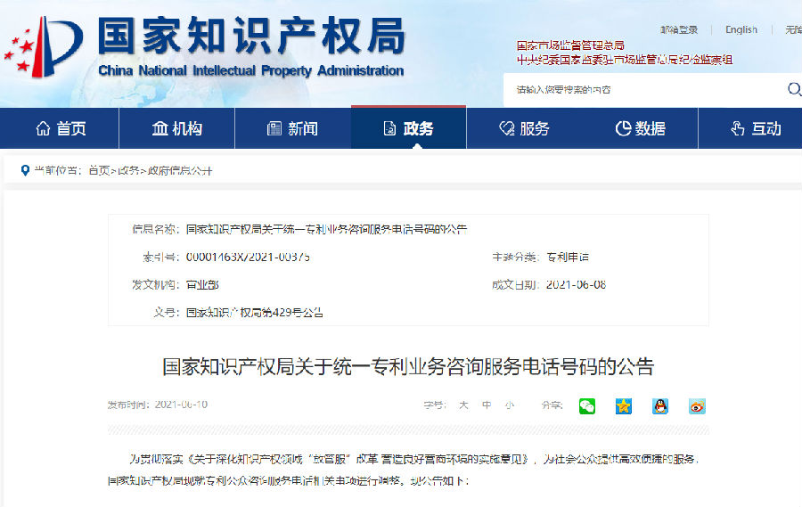 自2021年6月15日8时起,将专利业务、集成电路布图设计的相关咨询电话统一调整为010—62356655。