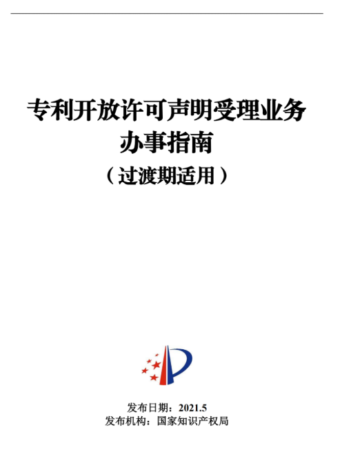 近日,国家知识产权局发布《专利开放许可声明受理业务办事指南(过渡期适用)》。本册办事指南仅适用于2021年6月1日修改后的专利法施行到专利法实施细则生效期间的过渡期内专利权人或其委托的专利代理机构提出专利开放许可声明的受理业务。