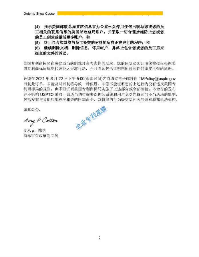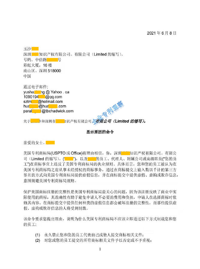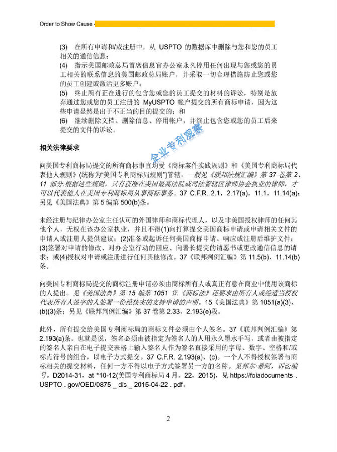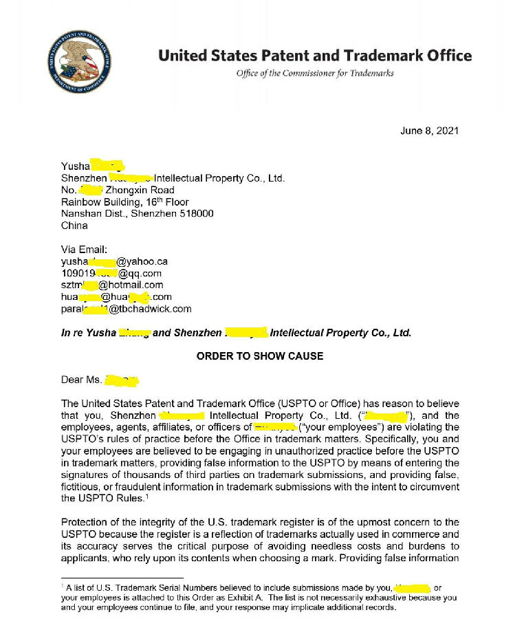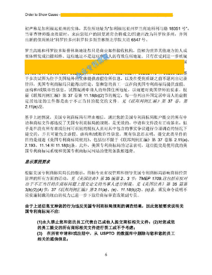 6月8日,美国专利商标局(USPTO)负责商标政策事务的副专员Cotton向中国深圳一家知识产权公司的代表人发出“ORDER TO SHOW CAUSE”。对该公司组织提交的大量美国商标的行为,尤其是其中涉及到第三方签名提供虚假、虚构和欺诈信息的行为提出质疑,要求该公司提出合理的理由,并在美国东部时间6月22日下午5:00前进行回复。否则USPTO将会进行制裁。