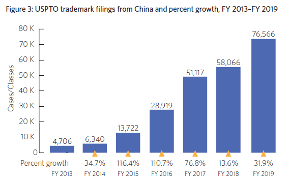 “2013年,深圳颁布操作规程,允许申请人在符合条件的外国(包括美国)申请注册商标,可获得5000元人民币(约750美元)的补贴。USPTO在2015年将其最低成本的全电子申请费降低至225美元后,在USPTO的申请费用大大低于补贴金额。在2013-2017财年中,来自中国的美国商标申请量增加了1264%,其中来自深圳的申请占2017财年中国申请的42%以上。”