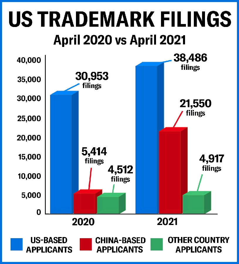 其中对于中国申请人近年来在美国快速增长的商标申请情况进行了分析,提到了在USPTO于2019年向议会提到的中国影响时引用的商标数据是“从2014年的5161件上涨到2018年的54064件”。实际上,经修正的数据后还要比听证会上的要多。尤其是上图显示,到了2021年4月份,来自中国的商标申请单月就超过了2.1万件。