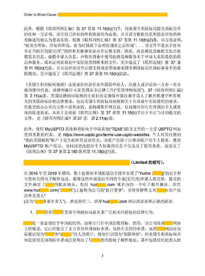 并且2016年至 2019年期间,现有信息表明,该公司代表曾建议客户考虑向美国专利商标局提交商标申请和其他文件,准备并起诉商标注册申请,准备并提交商标事宜的论据和修正,并代表客户与商标局沟通。当由非律师代表第三方完成时,这些行为中的每一个都构成违反美国专利商标局规则的未经授权的法律行为。在美国USPTO于 2019年8月3日实施美国法律顾问规则,要求USPTO受理的外国注册商标申请人由获得美国执业许可的律师代理后,该公司的员工违反了该规则,并继续违反USPTO的其他规则,包括隐瞒该公司员工参与起诉过程。