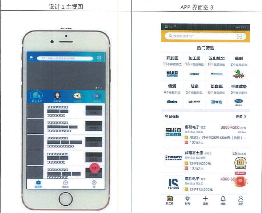 原告达家迎公司于2019年1月25日向国家知识产权局申请了名称为“用于手机的图形用户界面”的外观设计专利,2019年10月25日获得公告授权,专利号为ZL201930044419.0,目前处于有效状态。该外观设计产品用于运行软件的操作界面,设计要点在于屏幕中图形用户界面的界面内容,主视图界面是为手机上网打工者提供招聘信息的显示界面,由搜索栏、招聘信息介绍栏、功能选项和不同招聘信息列表组成。