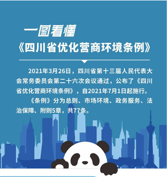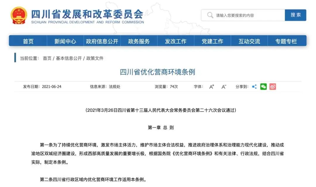 6月24日,政事君从四川省发改委获悉,《四川省优化营商环境条例》将于2021年7月1日正式施行。《条例》旨在持续优化营商环境,激发市场主体活力和维护市场主体合法权益,推进政府治理体系和治理能力现代化建设及推动成渝地区双城经济圈建设,形成西部高质量发展的重要增长极。