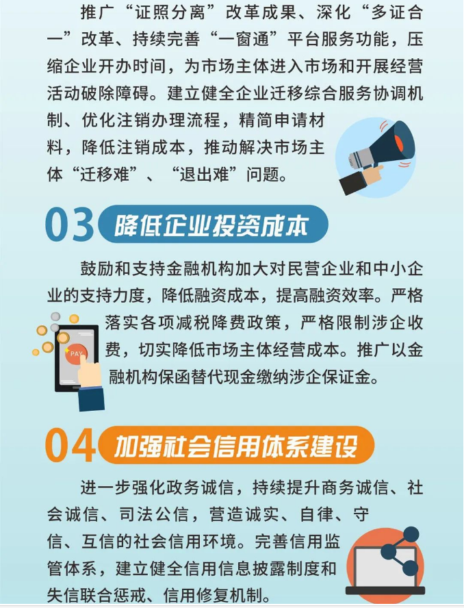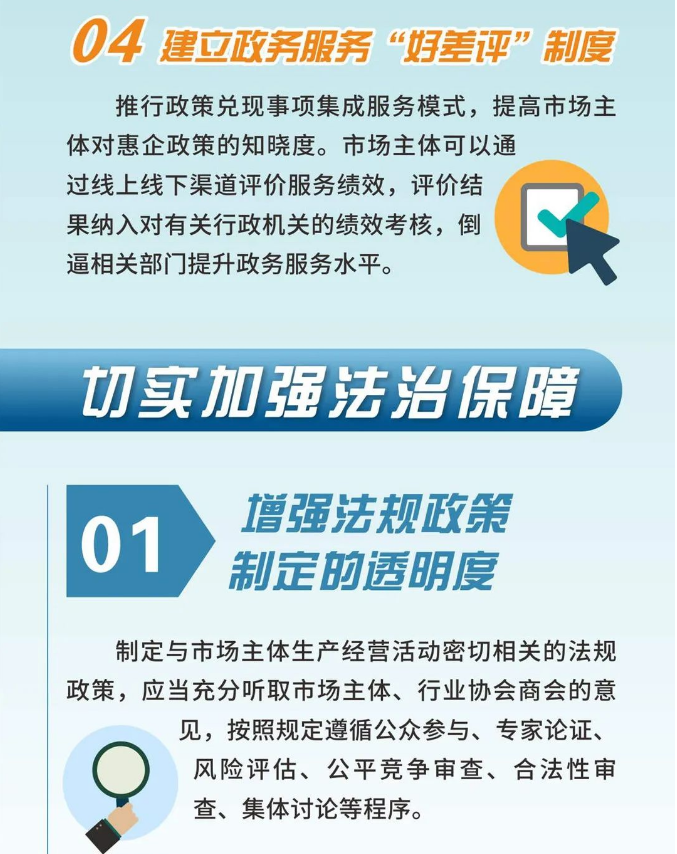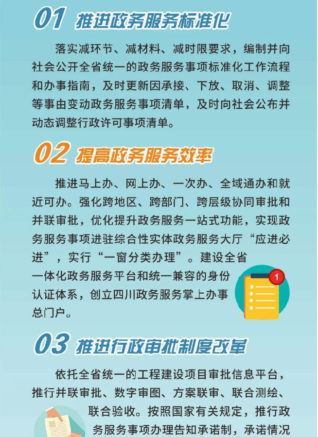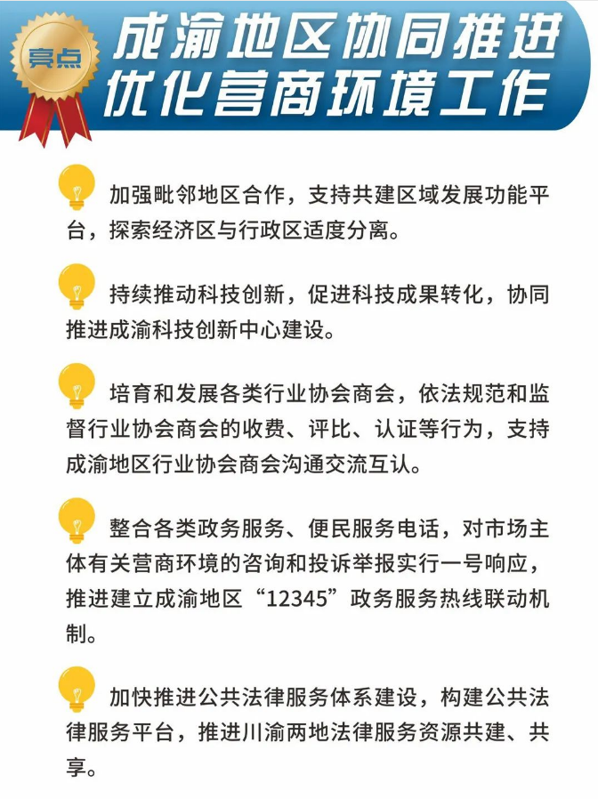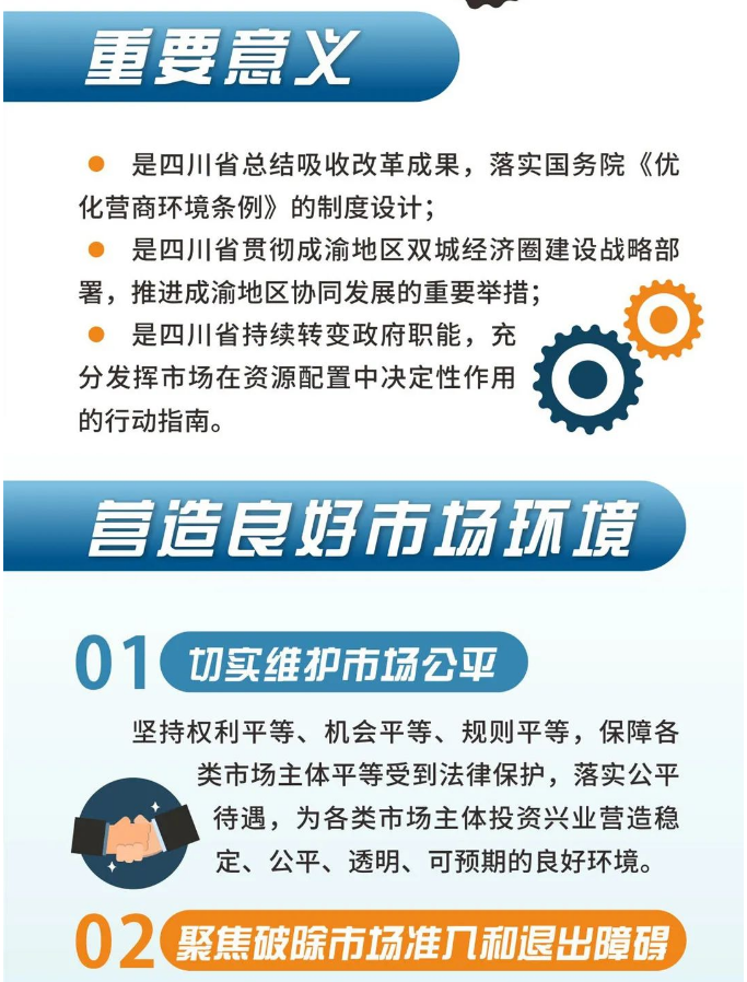《条例》共5个部分、77条细则,围绕营造公正文明、严格规范的法治环境,回应市场主体的需求与愿望,将“12345”查处回应机制、政务服务“好差评”制度、“天府通办”掌上服务平台等四川省在优化营商环境工作中的经验做法,在立法中加以规制,吸收最新改革成果,推行清单管理制度、建立容错免责机制、推进商事制度改革、实行包容审慎监管等。