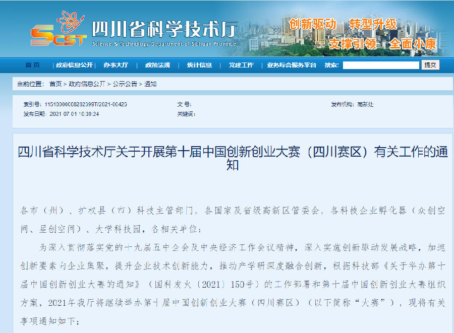为深入贯彻落实党的十九届五中全会及中央经济工作会议精神,深入实施创新驱动发展战略,加速创新要素向企业集聚,提升企业技术创新能力,推动产学研深度融合创新,根据科技部《关于举办第十届中国创新创业大赛的通知》(国科发火〔2021〕150号)的工作部署和第十届中国创新创业大赛组织方案,2021年我厅将继续举办第十届中国创新创业大赛(四川赛区)(以下简称“大赛”),现将有关事项通知如下: