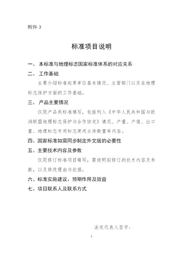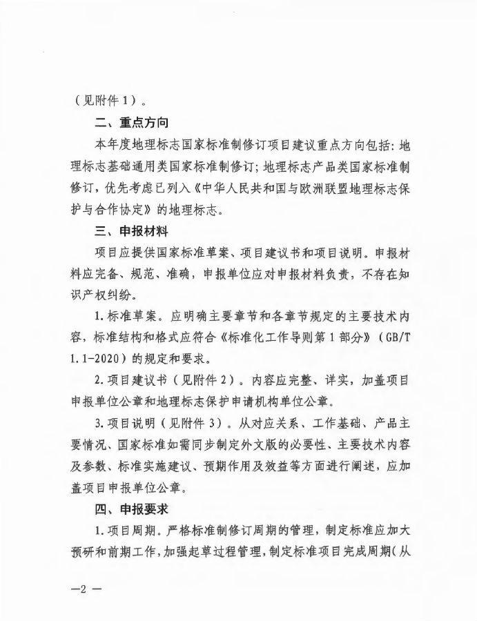 本年度地理标志国家标准制修订项目建议重点方向包括:地理标志基础通用类国家标准制修订;地理标志产品类国家标准制修订,优先考虑已列入《中华人民共和国与欧洲联盟地理标志保护与合作协定》的地理标志。