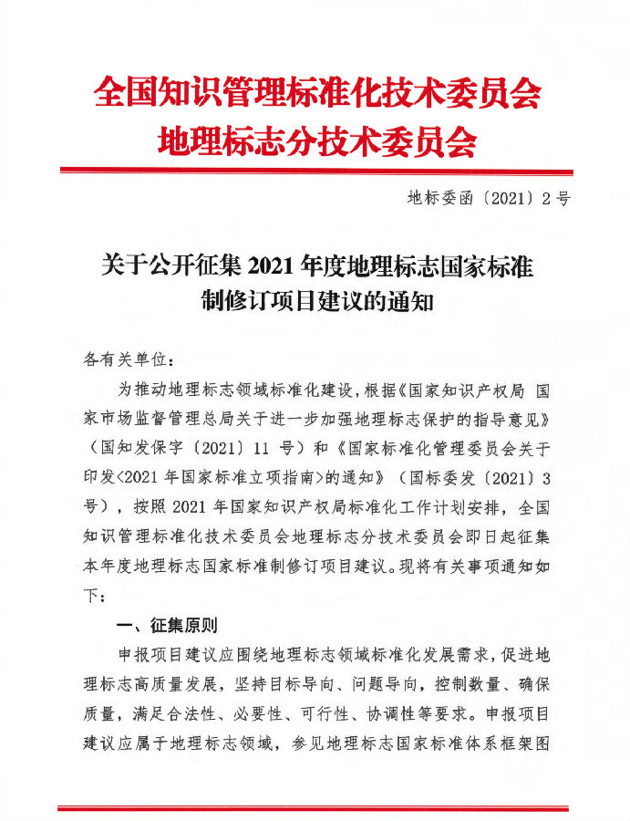 为推动地理标志领域标准化建设,根据《国家知识产权局 国家市场监督管理总局关于进一步加强地理标志保护的指导意见》(国知发保字〔2021〕11号)和《国家标准化管理委员会关于印发<2021年国家标准立项指南>的通知》(国标委发〔2021〕3号),在国家知识产权局指导下,2021年7月9日,全国知识管理标准化技术委员会地理标志分技术委员会启动征集2021年度地理标志国家标准制修订项目,组织各有关单位围绕地理标志领域标准化发展需求,促进地理标志高质量发展,坚持目标导向、问题导向,控制数量、确保质量,满足合法性、必要性、可行性、协调性等要求,对地理标志基础通用类和地理标志产品类国家标准制修订项目进行申报。