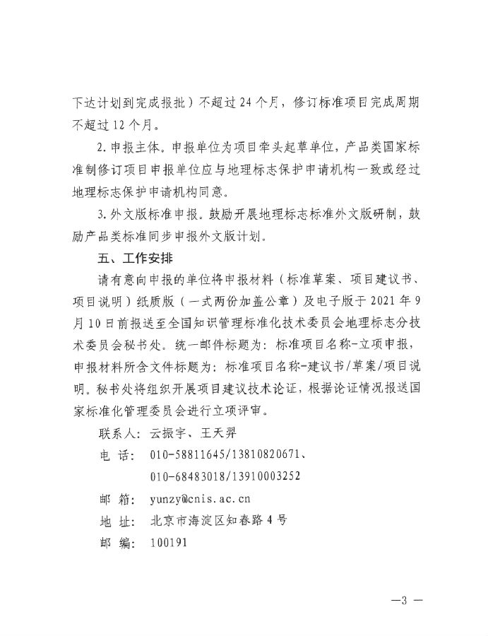 请有意向申报的单位将申报材料(标准草案、项目建议书、项目说明)纸质版(一式两份加盖公章)及电子版于2021年9月10日前报送至全国知识管理标准化技术委员会地理标志分技术委员会秘书处。统一邮件标题为:标准项目名称-立项申报,申报材料所含文件标题为:标准项目名称-建议书/草案/项目说明。秘书处将组织开展项目建议技术论证,根据论证情况报送国家标准化管理委员会进行立项评审。