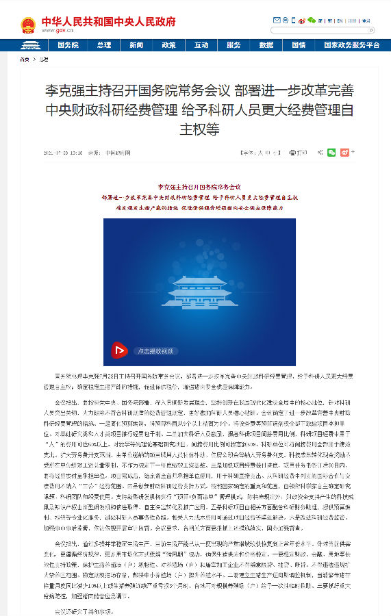7月28日,国务院总理李克强主持召开国务院常务会议。此次会议出台一揽子新规,来破除不符合科研规律的经费管理规定,给予科研人员更大经费管理自主权,以更好激励科研人员潜心钻研。